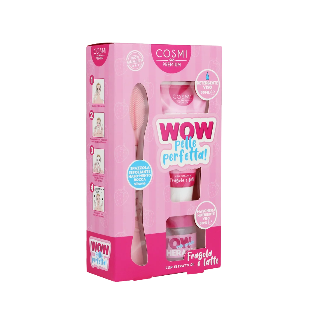 Il set per la cura del viso Wow è un kit completo per una pelle perfetta. Include una spazzola esfoliante in silicone per naso, mento e bocca, un detergente viso e una maschera nutriente viso al profumo di fragole e latte.